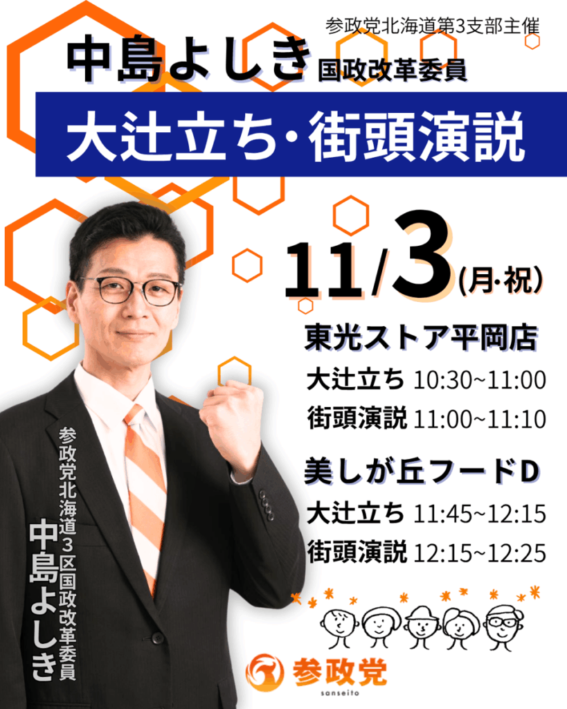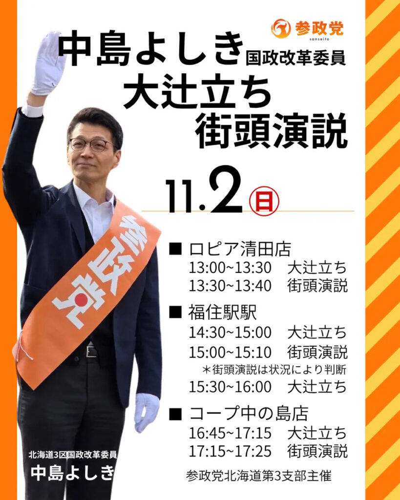 中島よしき 北海道3区国政改革委員の街頭演説と大辻立ちのご案内です。