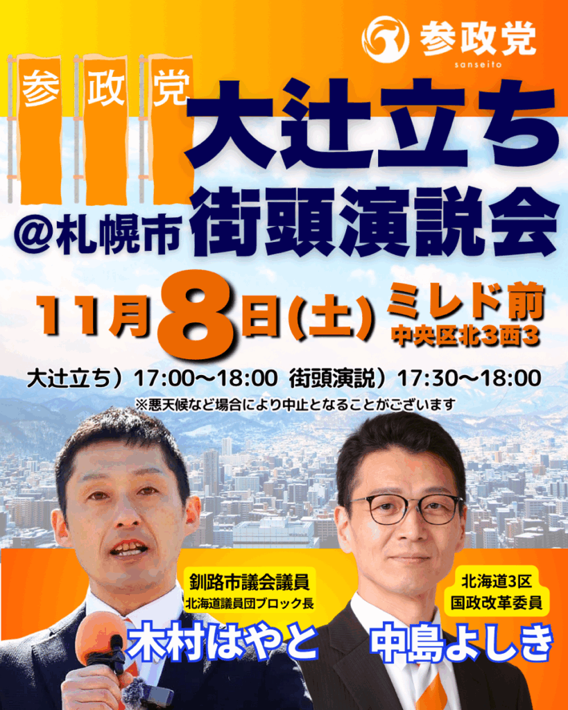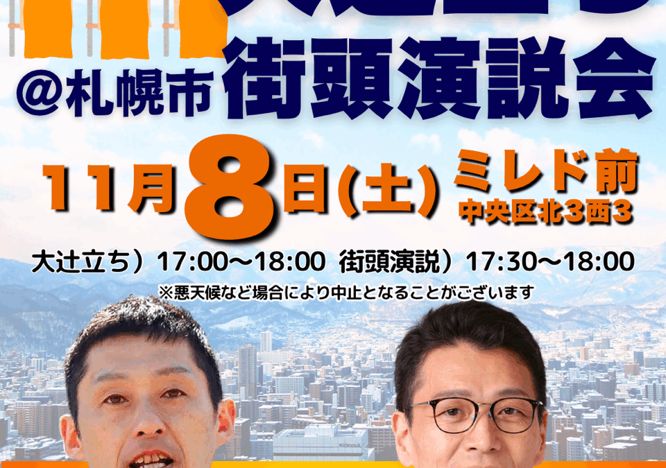11月8日(土)に札幌ミレド前(北3条西3丁目)で大辻立ち&街頭演説を開催いたします!
