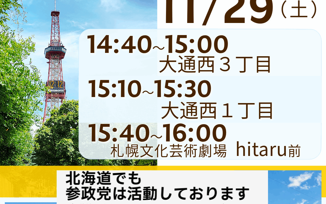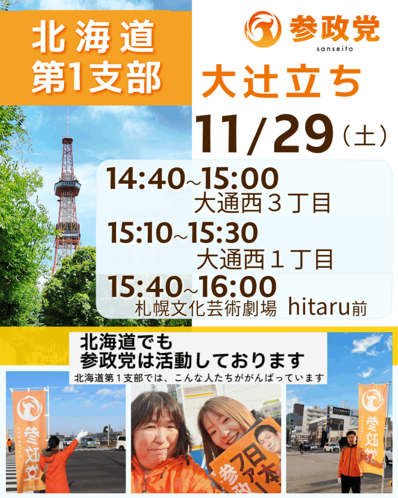 同じ日、『17〜18時 大辻立ち&街頭演説会』を『札幌ミレド前』にて行います。