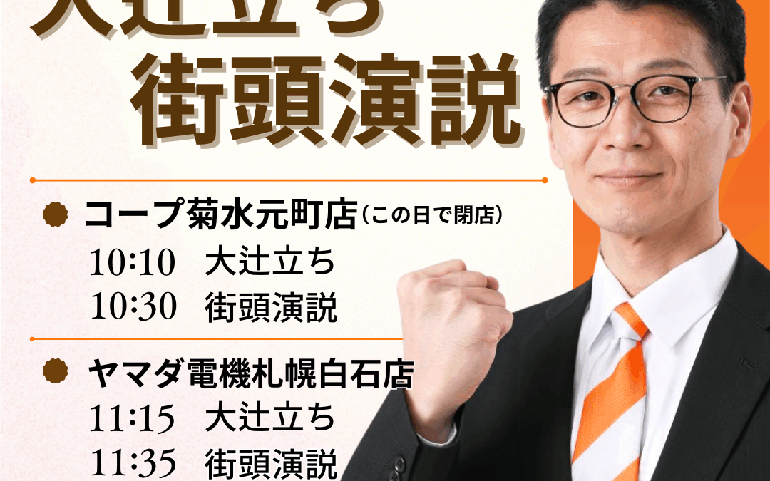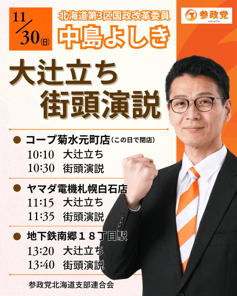 🟠中島よしき国政改革委員街頭演説と大辻立ちのお知らせ🟠