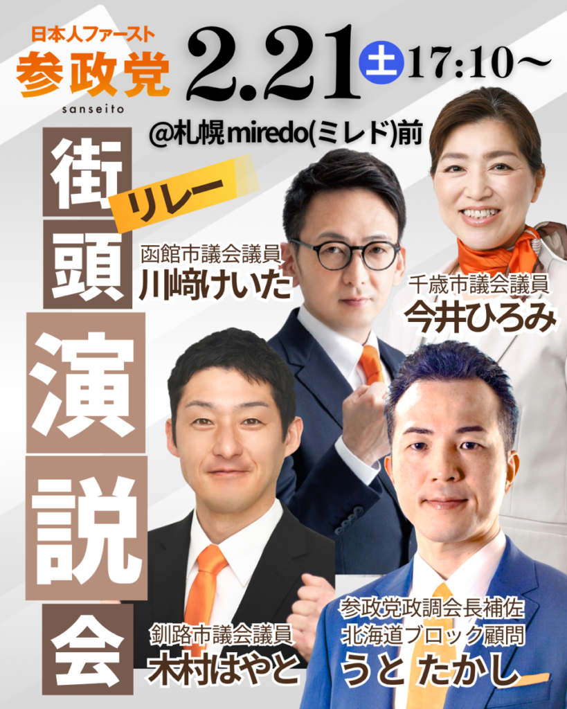 2月21日(土)札幌ミレド前にて【北海道参政党議員団】で街頭演説をいたします。